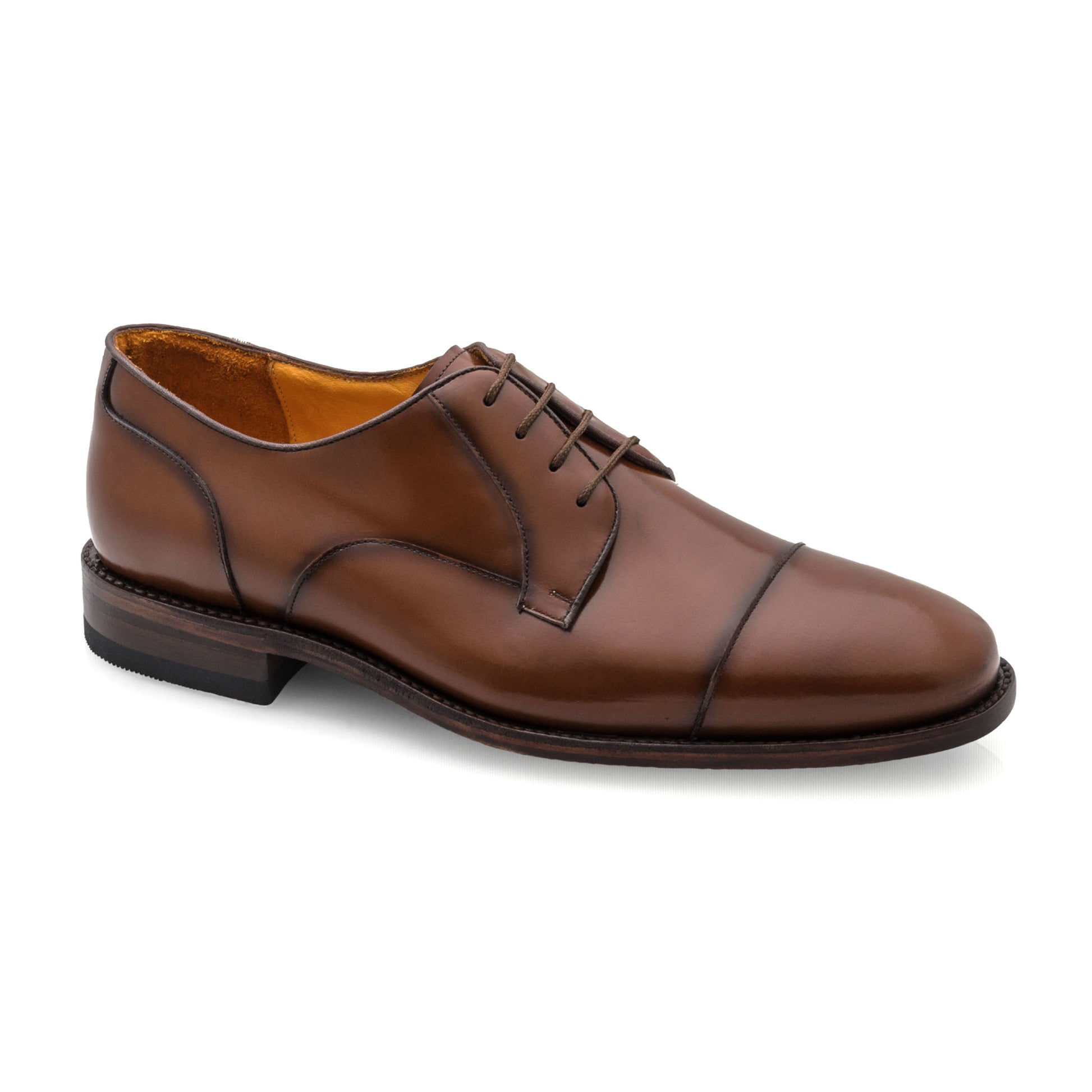 Elegante zapato tipo Oxford Cap-Toe en construcción Blake Rapid, confeccionado en exquisita Piel Camaleón en un vibrante tono Mandarina (Cognac). Este modelo 376 se distingue por su diseño formal de lazado cerrado, su puntera recta y refinada (Cap-Toe) y el brillo profundo y pulido que ofrece la Piel Camaleón. Ideal para atuendos de negocios o eventos formales. La construcción Blake Rapid garantiza una flexibilidad excepcional y ligereza, permitiendo que la suela sea completamente reemplazable, ofreciendo la combinación perfecta de estilo, confort y durabilidad.